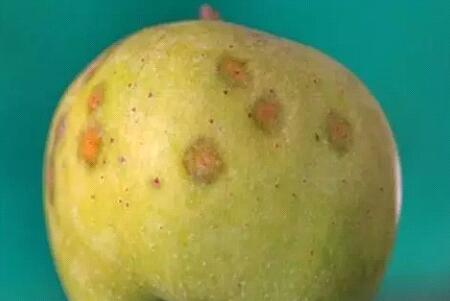 果實病斑:褐斑病菌侵染果實,形成淡褐色小點,擴(kuò)大后為褐色、圓形病斑,稍凹陷,邊緣清晰,散生黑色分生孢子盤。病斑下淺層果肉海綿狀壞死,但不腐爛。